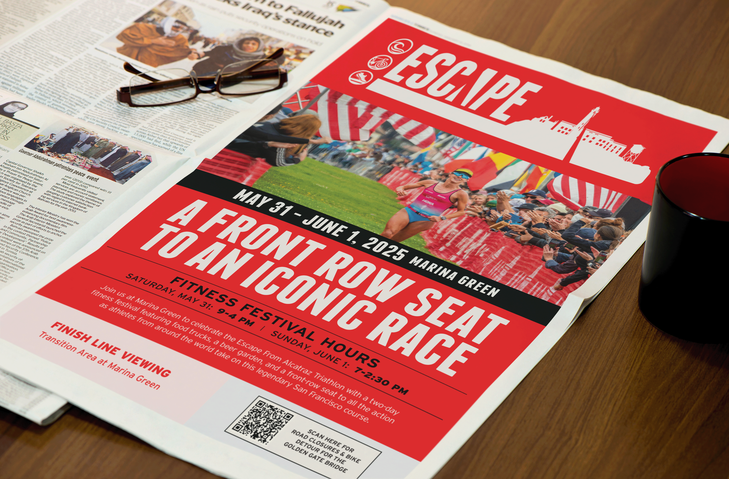 San Francisco’s Escape From Alcatraz Triathlon, a stop on the elite T100 Triathlon World Tour, is a race where athletes test their fitness in the area’s notoriously challenging terrain — think tumultuous Pacific waves and daunting urban hills. Ennis served as lead designer for the 2025 B2C campaign, expanding the brand’s aesthetic beyond that of previous years.